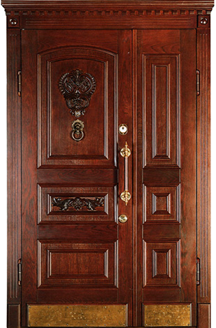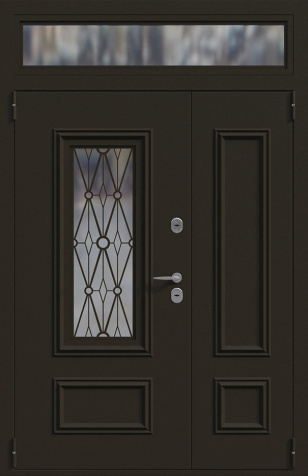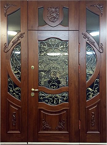 Дизайнерская входная дверь в частный дом с отделкой под дерево и решеткой №17