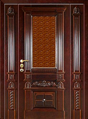 Дизайнерская входная дверь в частный дом с отделкой под дерево и решеткой №17